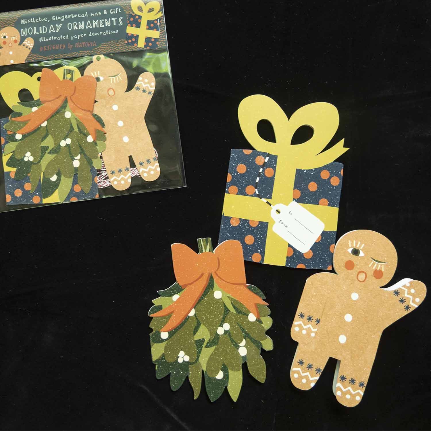 Die Girlande enthält drei typische Weihnachtsmotive: ein schön verpacktes Geschenk, einen Mistelzweig und einen Lebkuchenmann. Sie eignen sich als hübscher Weihnachtsschmuck für den Baum, zur Dekoration im Haus oder auch als originelle Geschenkanhänger! Sie sind auf beiden Seiten bedruckt und werden mit einer rot-weißen Schnur geliefert.