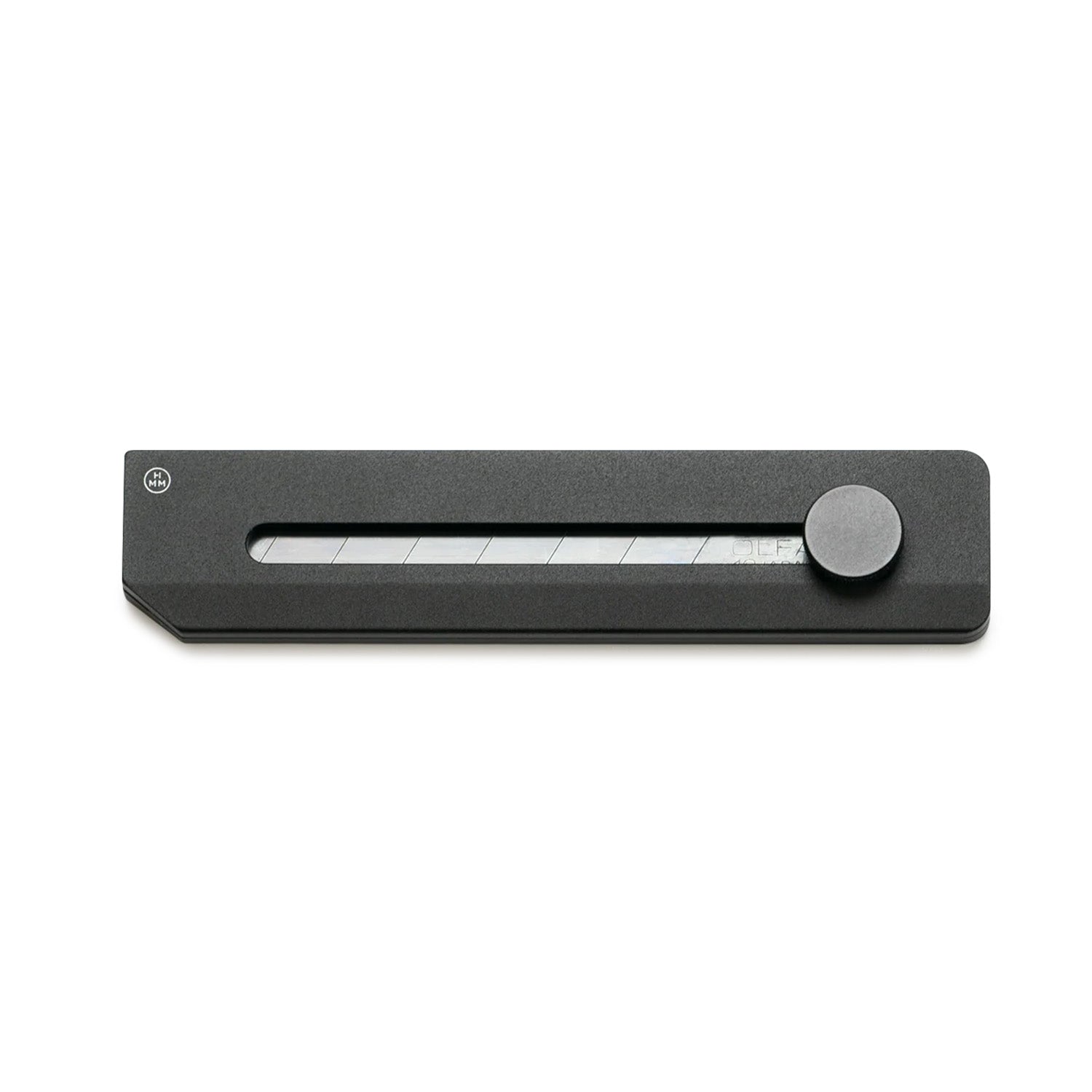 Ein Cutter, der nicht wie ein solcher aussieht – der hat am geschmackvoll gestalteten Arbeitsplatz noch gefehlt! Denn so praktisch die meisten Universalmesser sind, so wenig ansprechend ist ihr Äußeres. Ganz anders das minimalistisch anmutende Tool von HMM aus anodisiertem schwarzen Aluminium. Damit ist dem Designteam aus Taiwan ein weiterer großer Wurf gelungen. Das Cuttermesser ist mit einer breiten OLFA*-Klinge ausgestattet, die mittels einer massiven Schraube fixiert wird. Damit ist gewährleistet, dass die Klinge beim Schneiden stabil in ihrer Position gehalten wird. Seine Präzision und Robustheit machen den Cutter in Produktdesign, Lederhandwerk, Zimmererhandwerk und vielen anderen handwerklichen Anwendungen zum geschätzten Utensil.