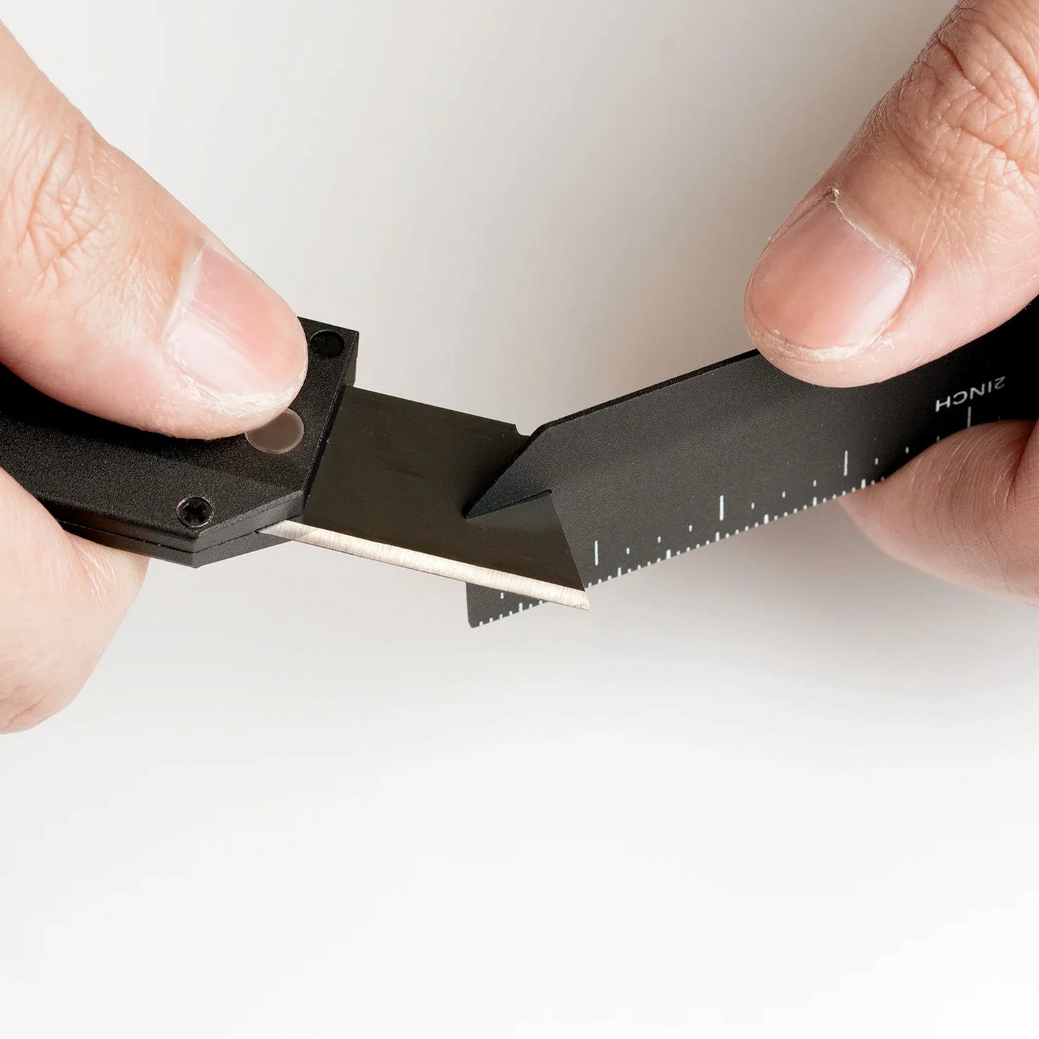 Ein weiteres überraschendes Detail: An der Rückseite haftet ein abnehmbares magnetisches Lineal mit cm- und inch-Skala. Es kann zur Führung für gerade Schnitte genutzt werden, ein eingefräster Schlitz hilft beim sicheren Abbrechen abgenutzten Klingen. Mit seinen nur 80 g lässt es sich leicht einstecken, so dass es auch unterwegs schnell ein präziser Schnitt gesetzt werden kann. Die CNC-gefräste Öffnung für die Klinge garantiert hohe Stabilität. Durch Anodisierung gewinnt das verwendete Aluminium an Härte, Verschleißfestigkeit, Korrosionsbeständigkeit und nicht zuletzt an Ästhetik.