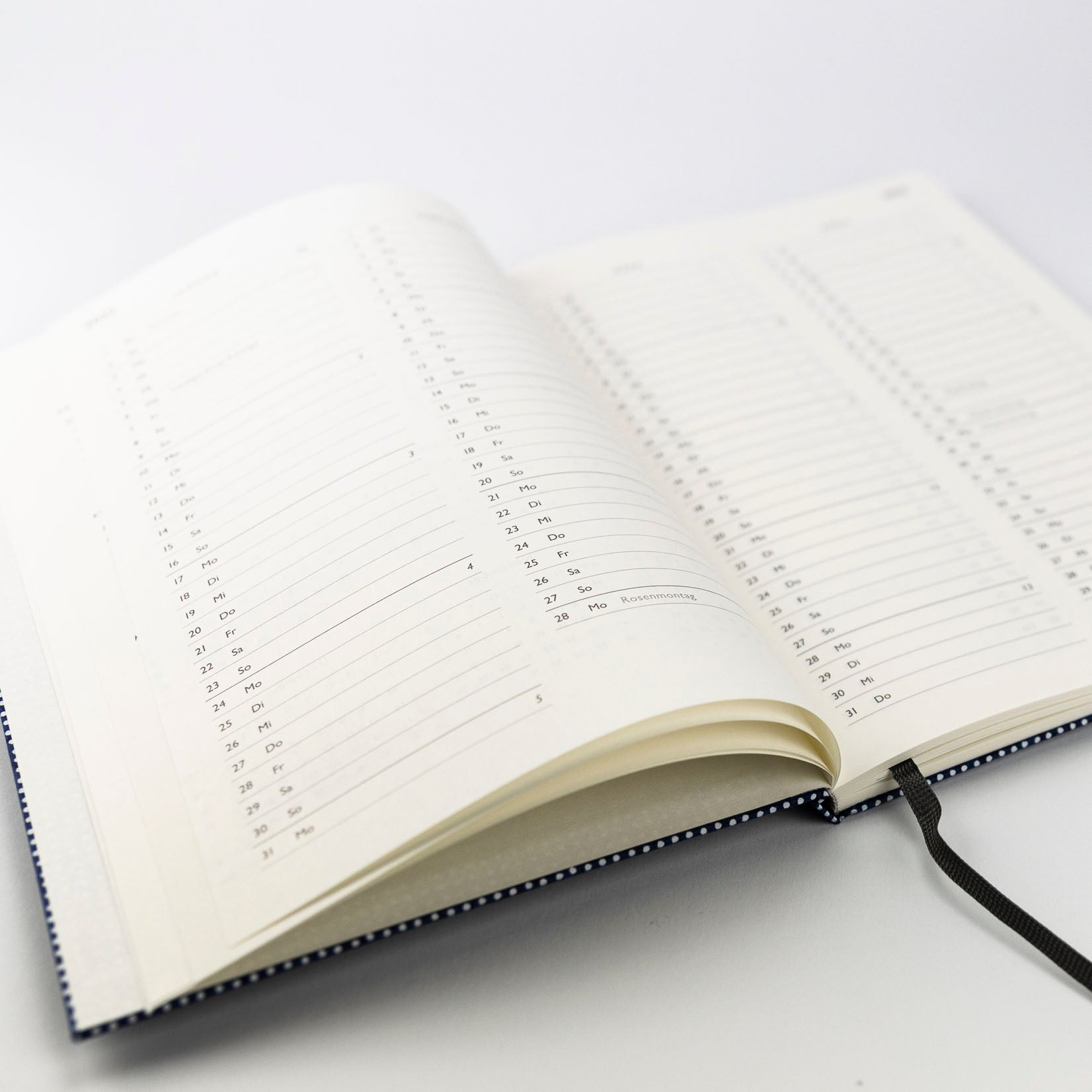 Ein eleganter Kalender von Carta Pura aus München, der ein ganzes Jahr lang Freude bereitet: auf den cremefarbenen Innenseiten gleiten unterschiedliche Schreibgeräte mühelos dahin, der feste Buchdeckel hält den wichtigen Inhalt 365 Tage lang zuverlässig zusammen. Als Einbandpapier wurde japanisches Chiyogami-Papier verwendet.