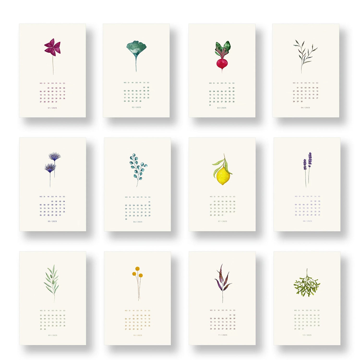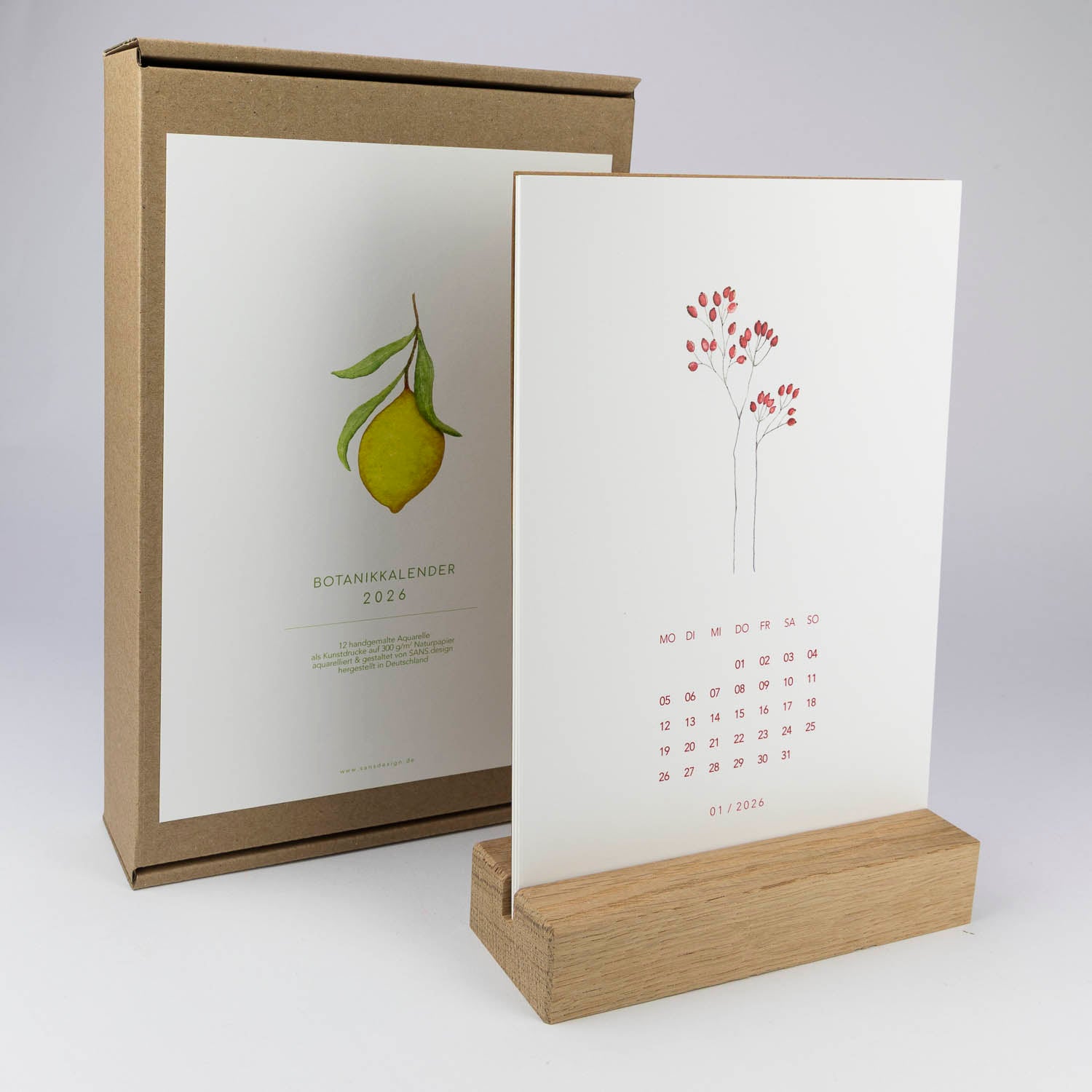 Vorlage für die zwölf Kunstdrucke auf hochwertigem cremefarbenem Naturkarton sind Aquarelle von Daria Sans. Sie bestechen durch ihre schlichte Eleganz, zu der auch die typografische Gestaltung des Kalendariums beiträgt. In der darauf abgestimmten Halterung aus Holz kommen sie bestens zur Geltung. Nach Ablauf des Jahres haben die schönen Blätter noch lange nicht ausgedient, auf ein kleineres Format zugeschnitten ergeben sie charmante Grußkarten oder machen in passenden Bilderrahmen eine gute Figur.