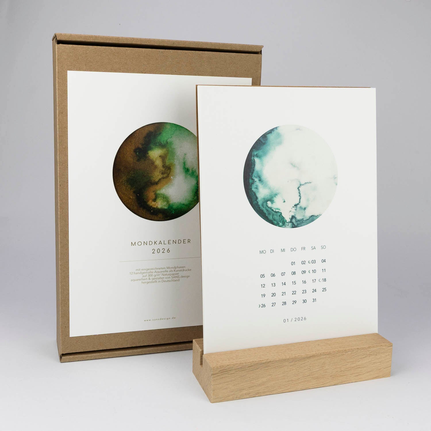 Vorlage für die zwölf Kunstdrucke auf hochwertigem cremefarbenem Naturkarton sind Aquarelle von Daria Sans. Sie bestechen durch ihre schlichte Eleganz, zu der auch die typografische Gestaltung des Kalendariums beiträgt. In der darauf abgestimmten Halterung aus Holz kommen sie bestens zur Geltung. Nach Ablauf des Jahres haben die schönen Blätter noch lange nicht ausgedient, auf ein kleineres Format zugeschnitten ergeben sie charmante Grußkarten oder machen in passenden Bilderrahmen eine gute Figur.