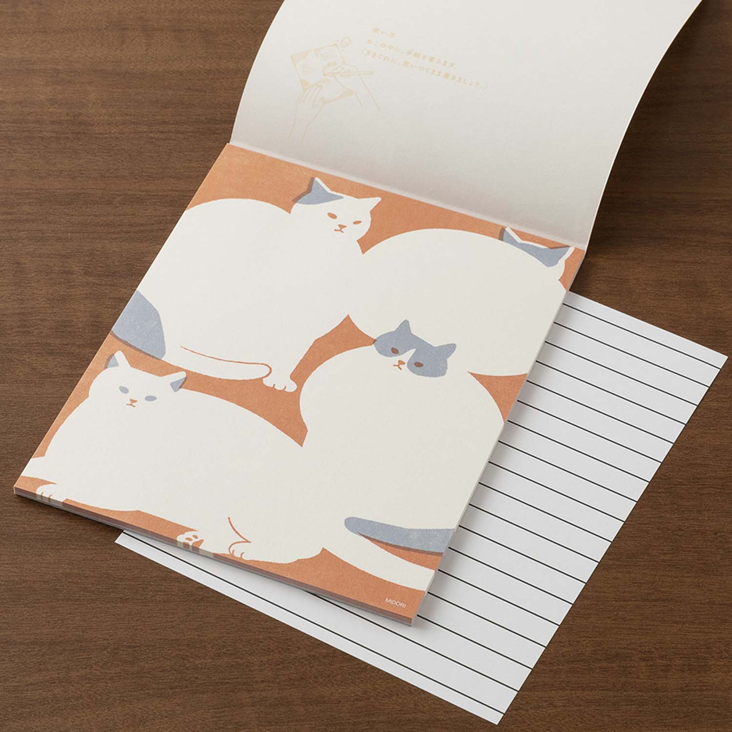 Briefpapier für Kinder oder Notizblock für jedes Alter - auf alle Fälle wieder einmal Gute-Laune-Design aus Japan von Midori: Der Briefblock ist mit Katzen bedruckt, die weißen Körperflächen lassen Raum für kurze Texte, Gedichte und Grüße. Der Druck weist mit Absicht kleine Unregelmäßigkeiten auf, was dem Block einen gewissen Vintage Charme verleiht.